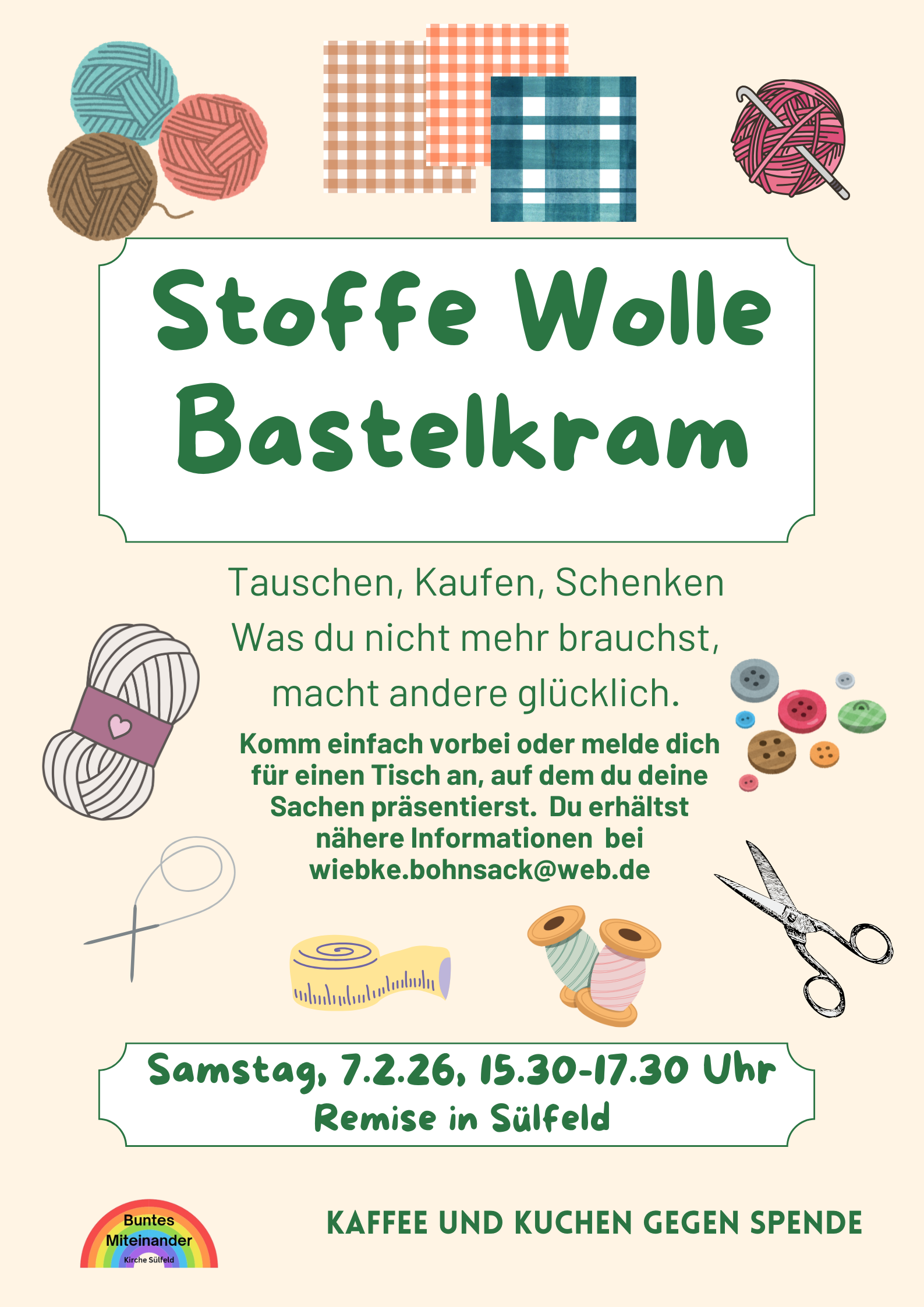 Biete an oder komm vorbei zur Tauschbörse. Stoffe, Wolle, Bastelkram werden angeboten zum Tauschen, zum Verkaufen gegen kleines Geld und zum Verschenken. Wer etwas anbieten möchte oder weitere Infos braucht, melde sich bitte an bei wiebke.bohnsack@web.de